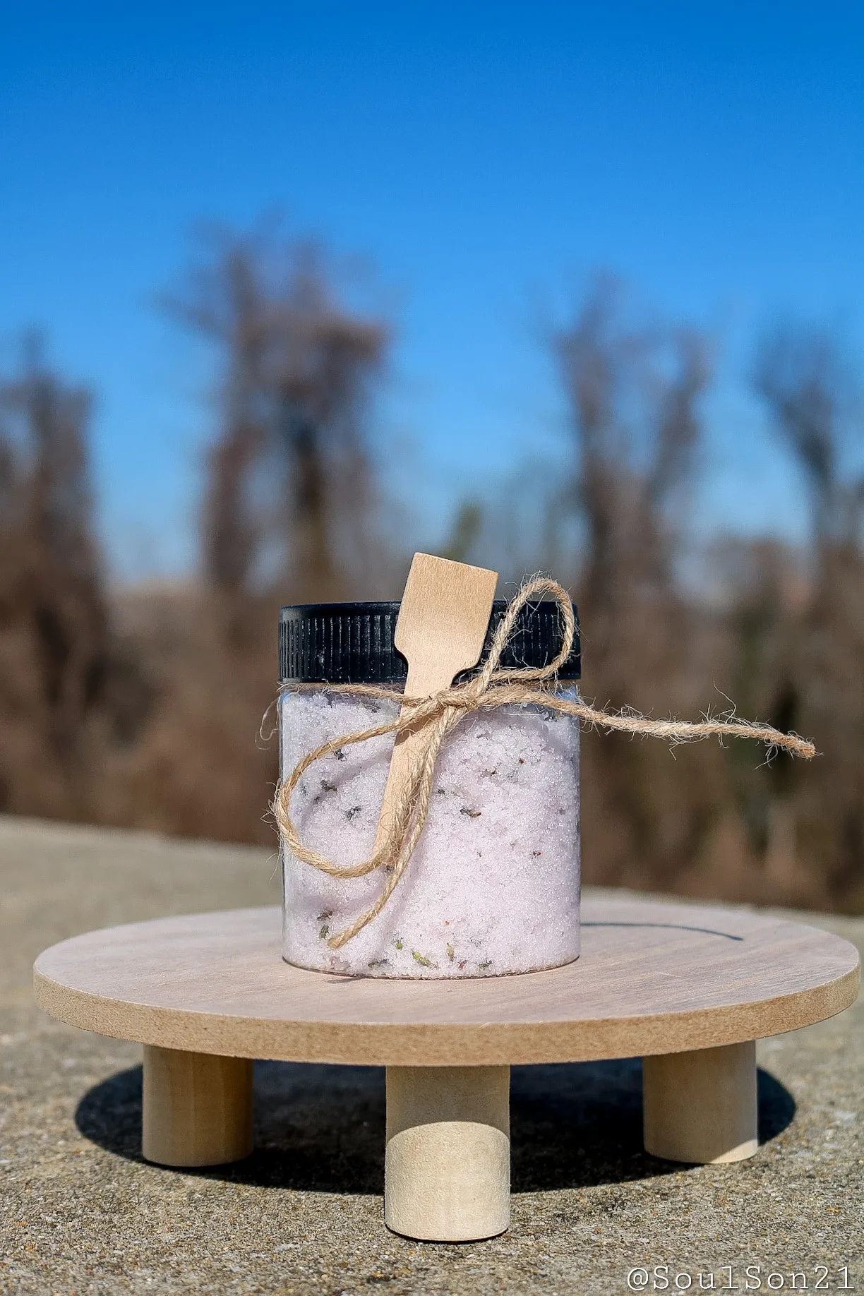 CBD-infused lavender body scrub with lavender flowers and organic sugar.